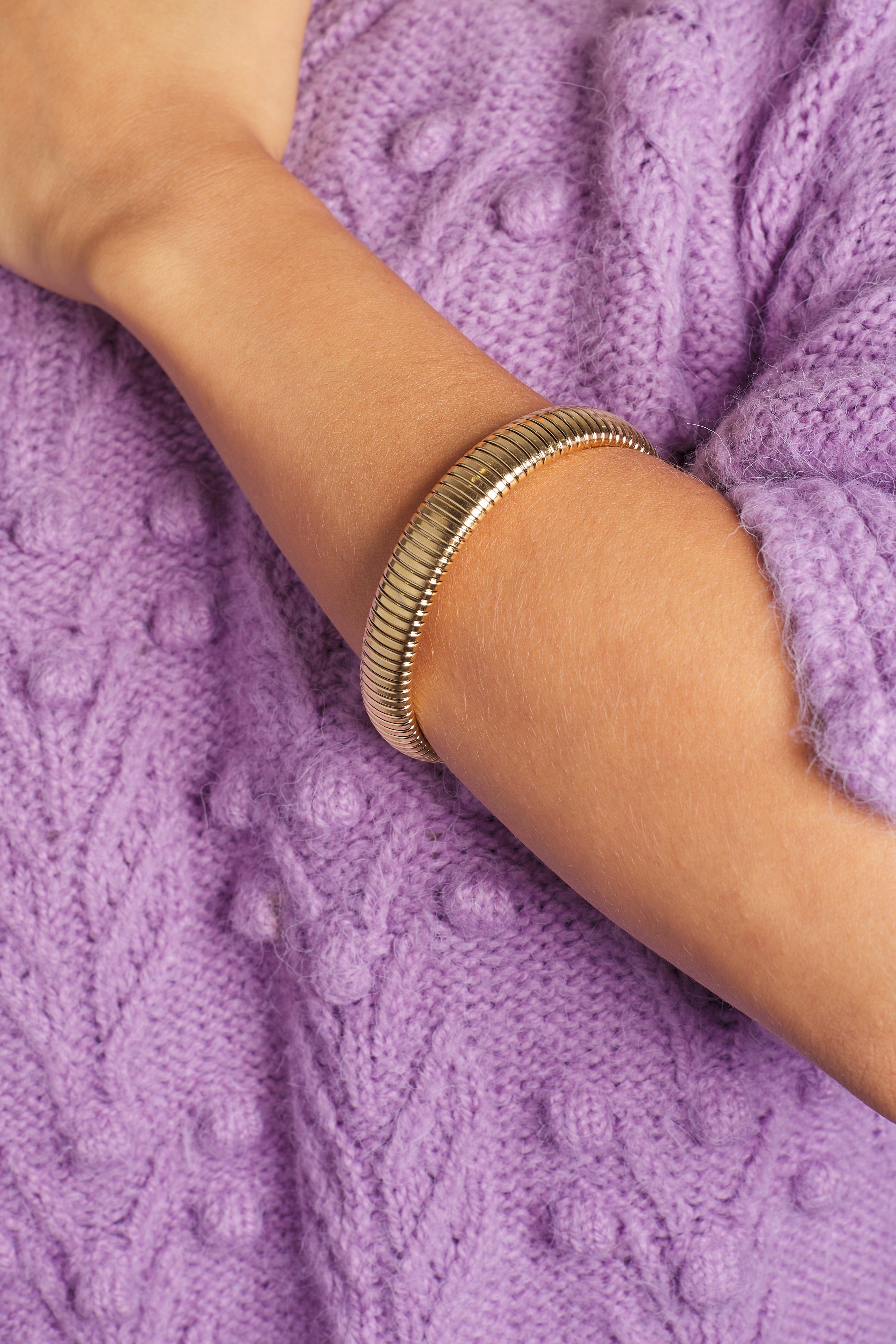 La pulsera semirrígida Maï se convertirá en tu favorita, vas a querer llevarla siempre en tus mejores citas, se adapta súper bien a la muñeca y medio brazo, puedes jugar con ella y usarla que se vea simple o por el lado de la abertura. su diseño flexible rayado no puede ser más preciosa.