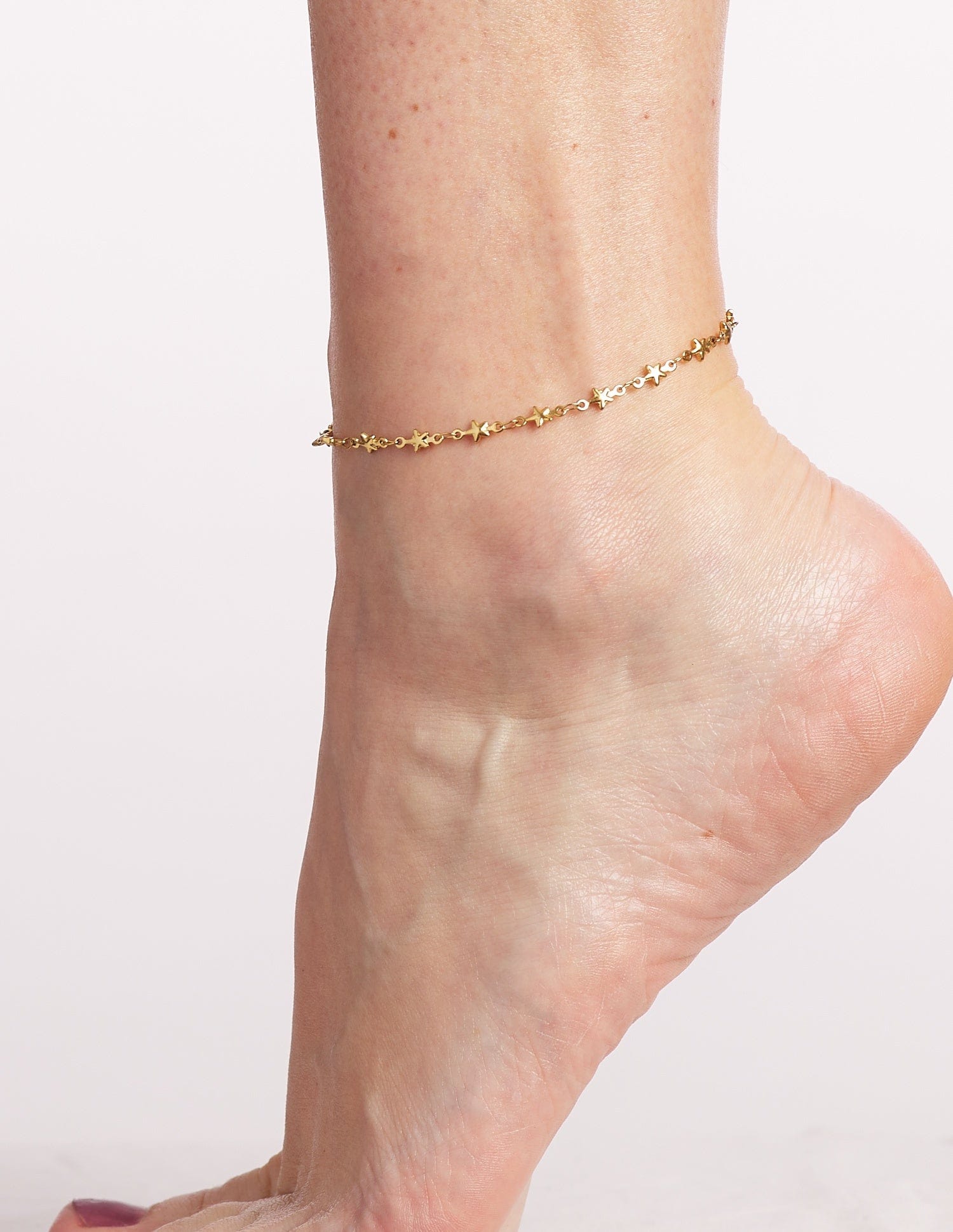La tobillera Lin, es original, divertida y súper cómoda, está compuesta por estrellitas unidas entre sí, perfecta para combinar con otras, en la foto te enseñamos ideas de combis. Y sí, se puede mojar!, No, no se pone fea!